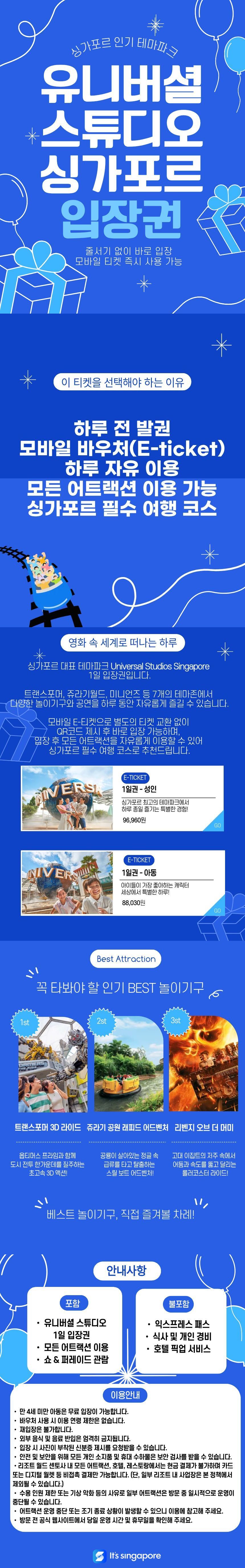 싱가포르 대표 테마파크 Universal Studios Singapore 1일 입장권입니다. 트랜스포머, 쥬라기월드, 미니언즈 등 7개의 테마존에서 다양한 놀이기구와 공연을 하루 동안 자유롭게 즐길 수 있습니다. 모바일 E-티켓으로 별도의 티켓 교환 없이 QR코드 제시 후 바로 입장 가능하며, 입장 후 모든 어트랙션을 자유롭게 이용할 수 있어 싱가포르 필수 여행 코스로 추천드립니다!
